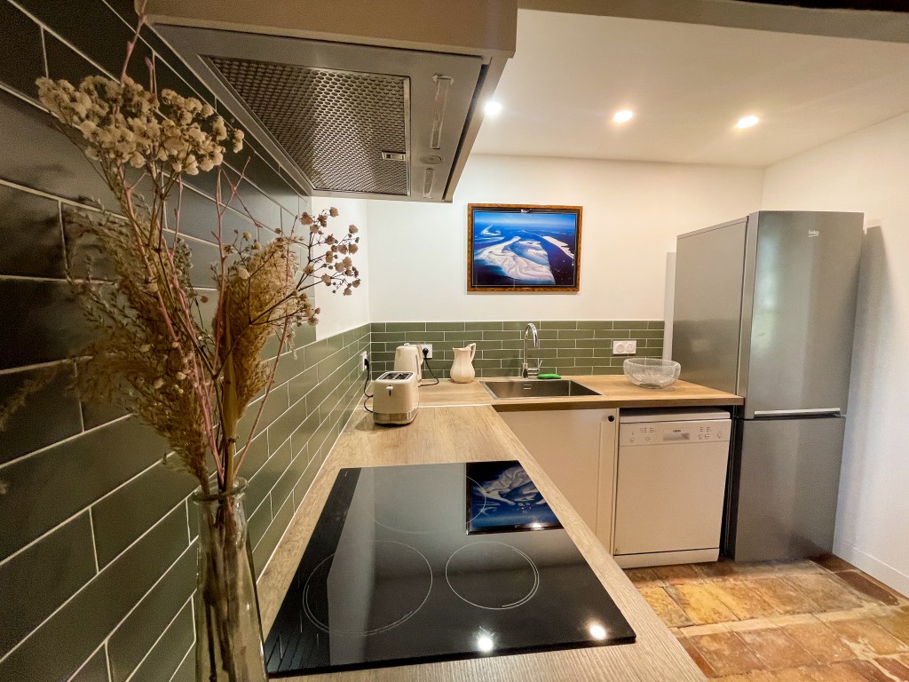 Cuisine équipée avec coin repas. Accès direct à la terrasse pour prendre vos repas, avec vue sur les chevaux dans les pâtures.